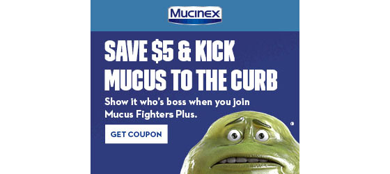 When you join Mucus Fighters Plus for Free, Mucinex® will send you an exclusive $5 coupon and other special offers, plus tips for putting mucus in its place.