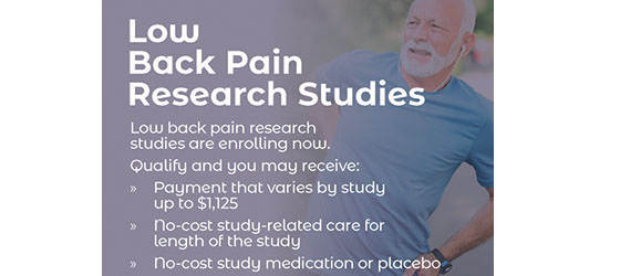 Have lower back pain? Studies are enrolling now! Those who qualify will receive payment up to $1,125. No-cost study-related care from local doctors. No-cost study medication. No health