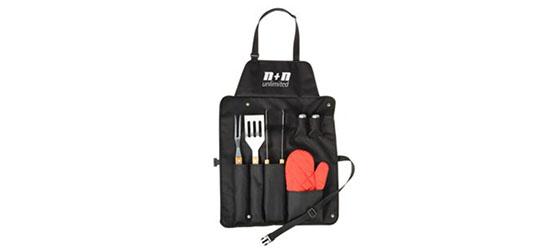 Get a Free BBQ Now Apron and BBQ Set! This handy set includes an apron, spatula, fork, tongs, oven mitt, and a salt and pepper shaker.